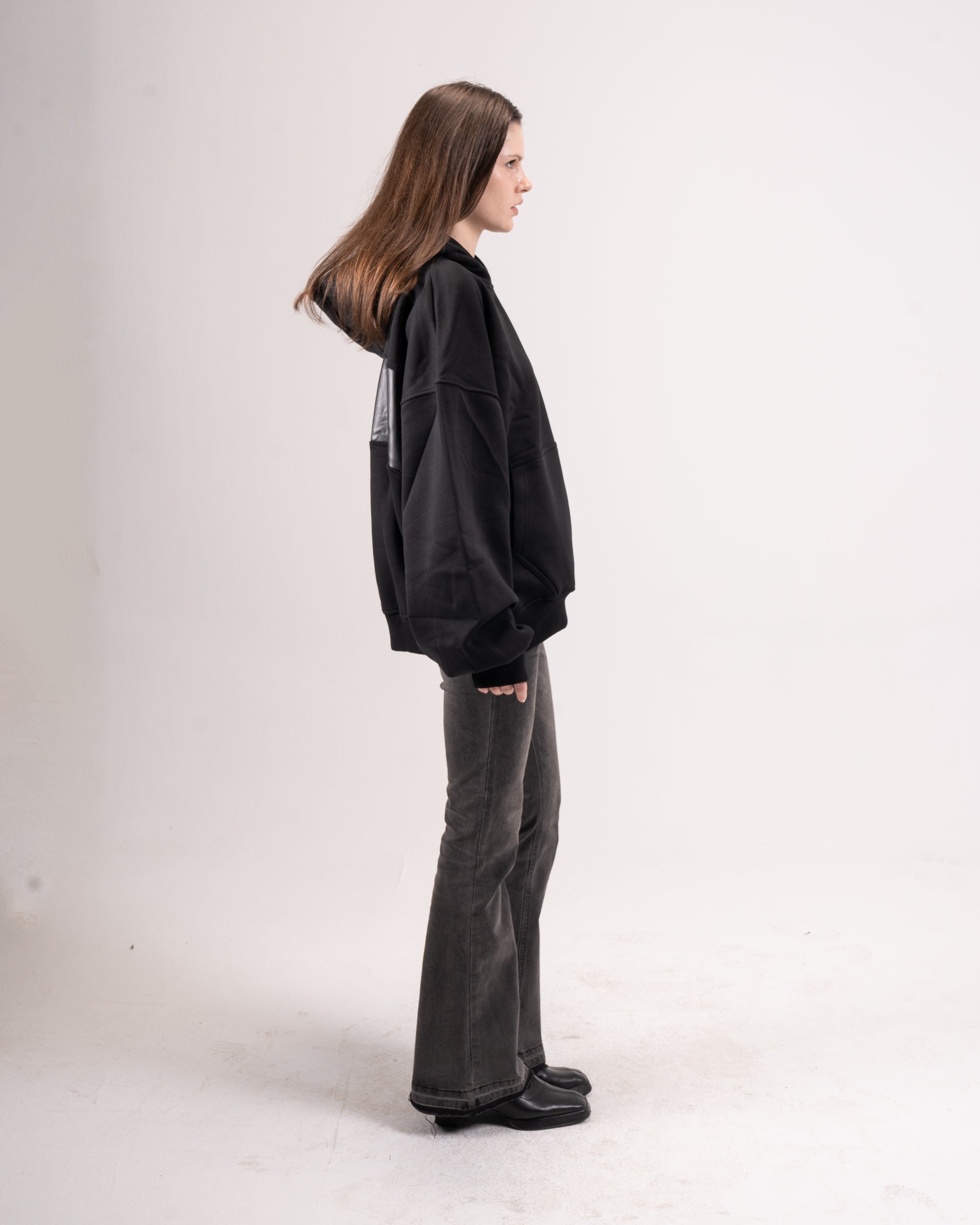 The Back Line Hoodie elevates a classic silhouette with a bold leather strip across the back.
